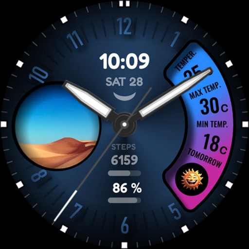 Set your favorite color for this classic hybrid (analog and digital) Wear OS watch face. Complications: date, battery level & steps. Update: Weather added.